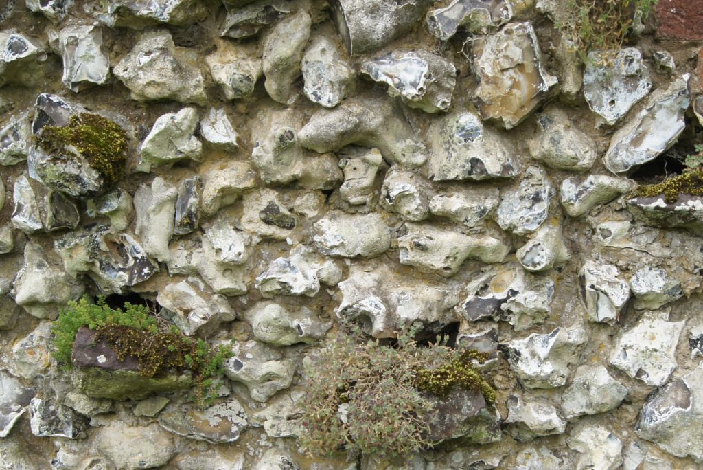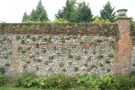 Die Mauer des Walled Garten, in unregelmäßigen Abständen sind Steine herausstehend eingemauert, auf dem sich Pflanzen halten.