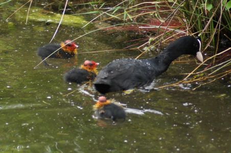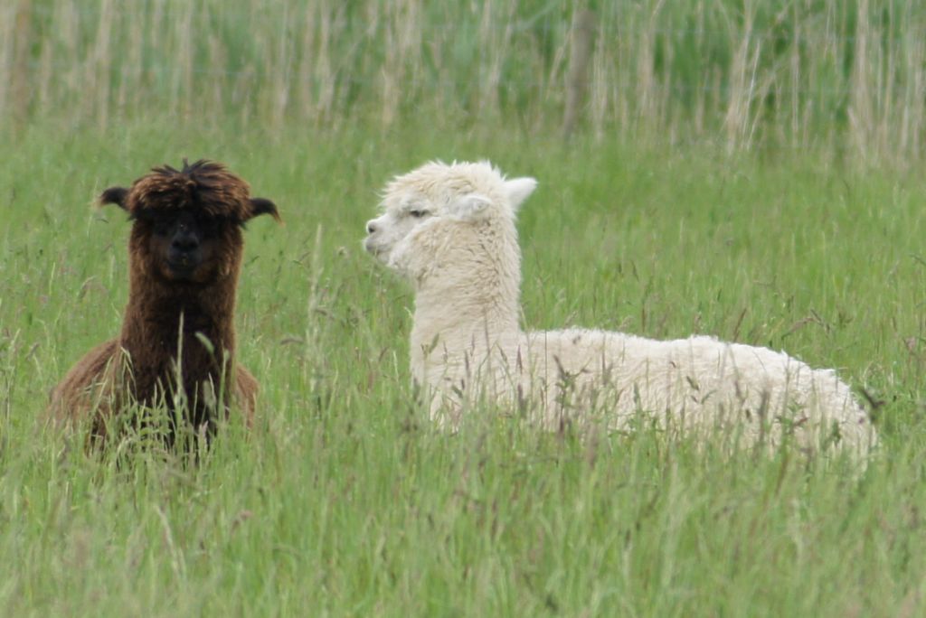 Alpakas liegen im hohen Gras - junge Enten, noch mit nackten Kopf