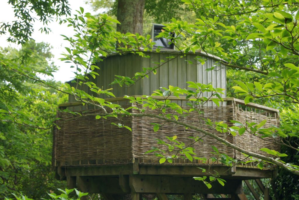 eine aufgeständerte kleine Hütte in der ein abgedunkelter Raum ist. Auf